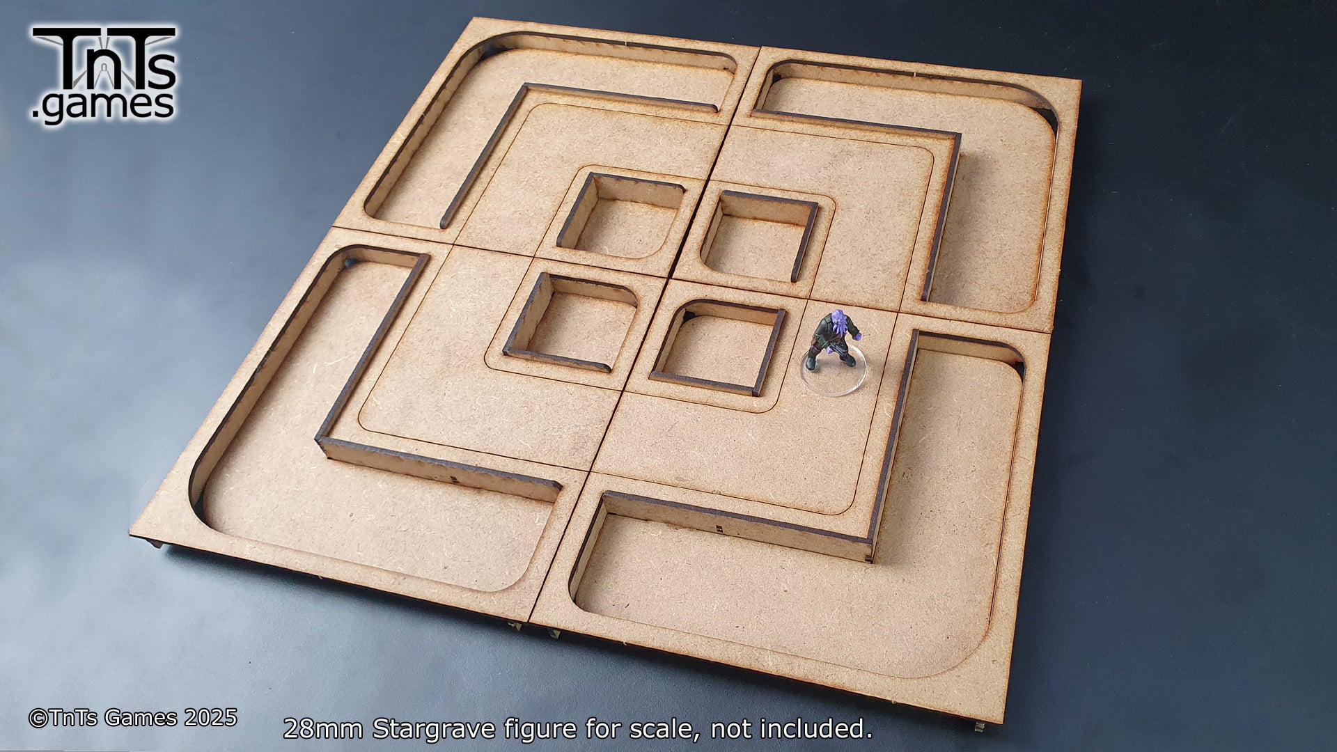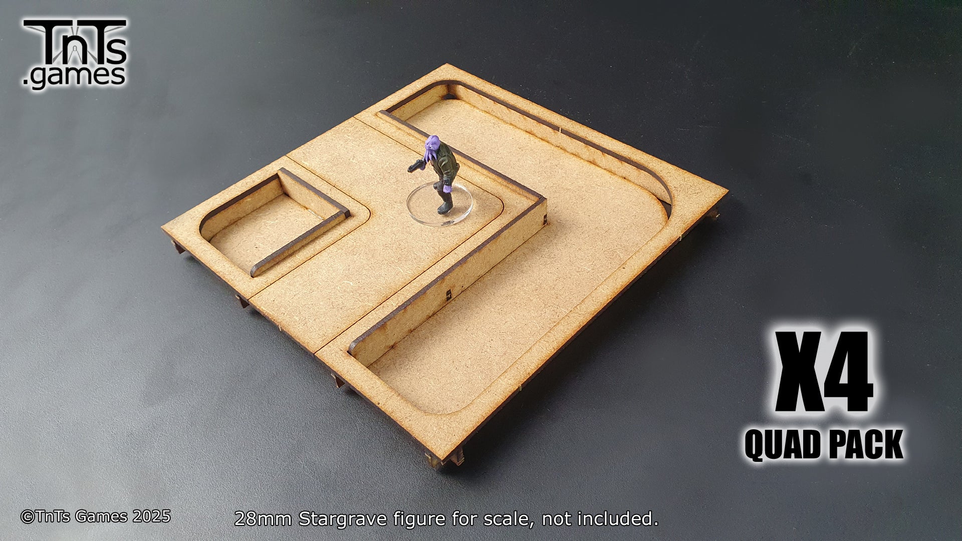 This set contains 4 - 150mm modular room tiles. With the more generic tiles you can swap the walls around to create additional variation. Allowing you to mix and match your walls, windows and doors between sets.