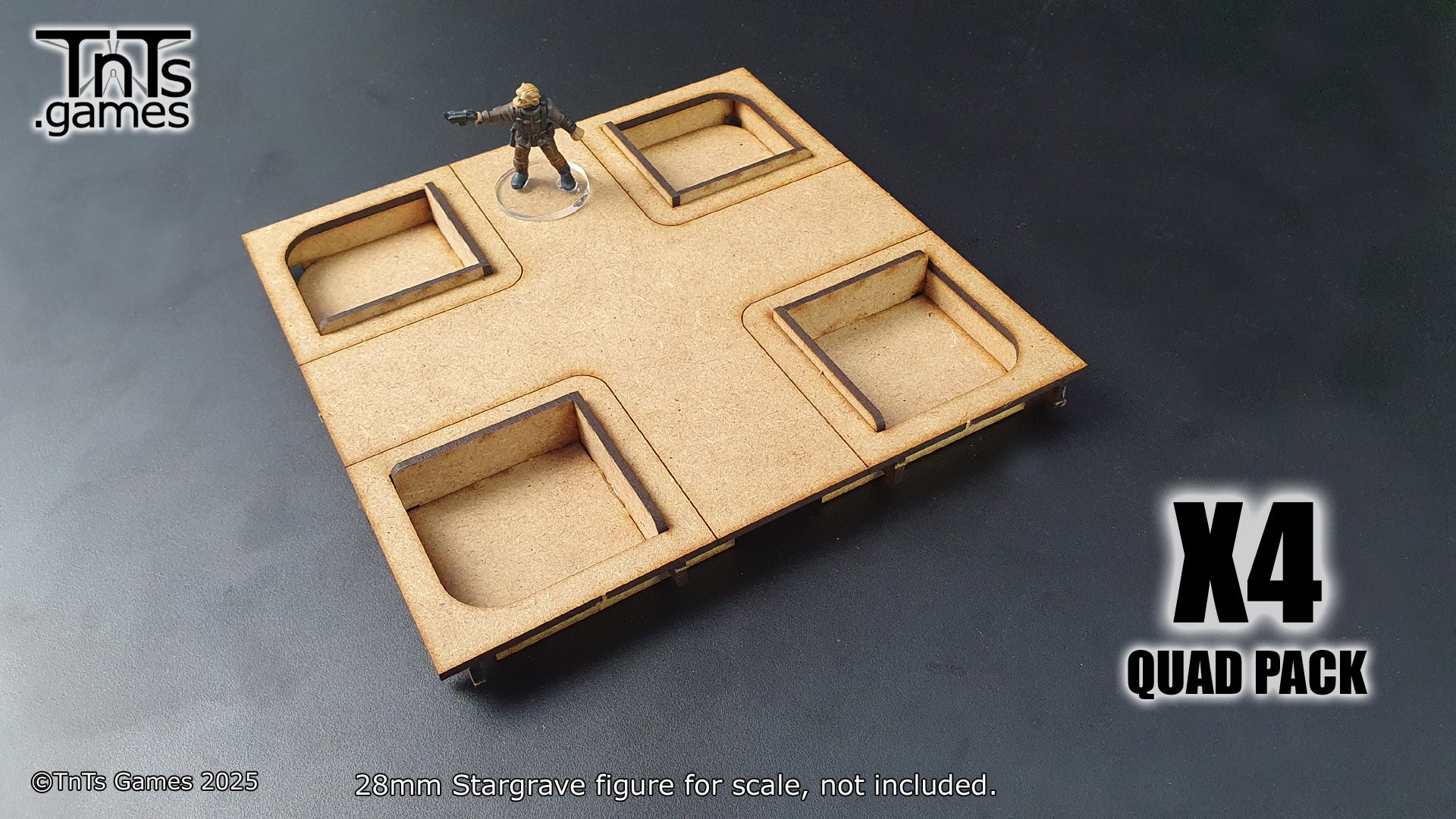 This set contains 4 - 150mm modular room tiles. With the more generic tiles you can swap the walls around to create additional variation. Allowing you to mix and match your walls, windows and doors between sets.